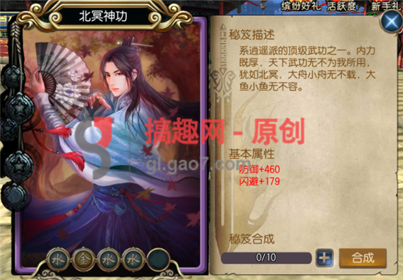 东方不败手游北冥神功秘笈的基本属性:防御+460,闪避+179