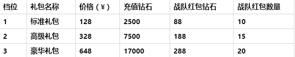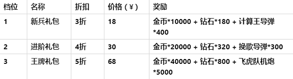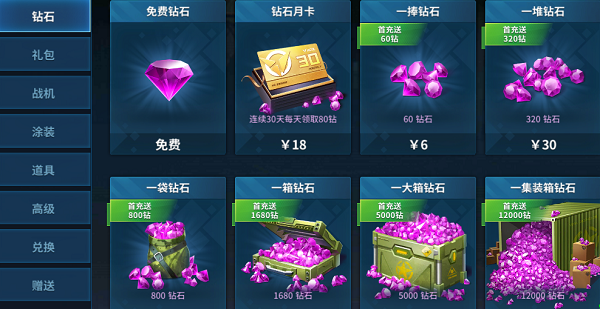 今天小编带大家了解一下钻石商城和礼包商城吧! 一、钻石商城 钻石商城是玩家获取钻石的主要途径,当前商城中有三种方法获得钻石:免费获取钻石、钻石月卡、钻石包。 ![]() 1.免费钻石 免费领取钻石的按钮入口有变动。之前版本中,免费视频广告的按钮是直接显示在机库主界面的,而在新版本中,玩家可通过点击主界面的商城按钮,在钻石商城中点击“免费钻石”按钮,来获取免费的福利钻石。玩家可以做任务获得积分换取钻石,也可以观看视频广告直接获取钻石。 2.钻石月卡 玩家购买“钻石月卡”,消费18元,连续30天,每天可以领取80钻石,共计2400个钻石。需要注意的是,购买钻石月卡后,每天0点重置当日领取状态和更新剩余天数,也就是说,如果当天未领取月卡钻石的话等到第二天就只能领取第二天的钻石了,因此要记得每天登录领取钻石奖励。 3.钻石包 玩家可以直接充值购买钻石。 目前游戏内共分为6个充值档位: ![]() 对于萌新而言还有一大福利——首充送钻石,我们可以看到商城界面的每个充值档位上都有一个首充标签,每个充值档位在首次充值时都会有一次获得双倍钻石的机会。也就是说,新玩家首次充值6元,除了获得本身价值的60钻石外,还将额外获得赠送的60钻石,新玩家接着充值30元时,除了获得本身价值的320钻石外,同样还将额外获得赠送的320钻石。 为了感谢广大老玩家长期以来的支持,在本次版本更新后,所有老玩家也同样享受到首充优惠的待遇,所有首充奖励待遇与新玩家一致。 二、礼包商城 礼包商城中包含了游戏中的各种礼包,包括新手限时礼包、每日限购礼包、周末限时特惠、战队补给礼包,除此之外还有每个节日来临时的节日礼包。下面就详细介绍一下各个礼包中都有哪些宝贝吧。 ![]() 1.新手限时礼包 新玩家注册游戏后可以在礼包商城中看到,新手礼包中的道具都是新手前期最为急缺的,并且还能享受超低的折扣优惠价,可谓是物美价廉非常实惠,强烈推荐新手购买。 ![]() 礼包持续时间一直到新玩家注册后的第30天,每个新手礼包只能购买一次,当新手礼包被购买或超过持续时间后就会被下架。因此,想购买的玩家千万不要错过购买时间。 值得一提的是,本次更新同样会给老玩家一次福利回馈,在版本更新后所有老玩家同样享有购买新手礼包的资格,在版本更新后的三十天后过期。心动的小伙伴记得去商城购买吧。 2.每日优惠礼包 每日在礼包商城中都会推送一次,每天重置购买状态,礼包5折优惠,只需6元即可获得价值12元的每日礼包,包含 金币*2000 + 钻石*60 + 低级金币卡*1。 ![]() 3.周末限时礼包 每周六在礼包商城中推送,持续2天,每次推送期间每种礼包限购一个。目前每周推送两个档位的礼包,分别为12元和18元周末特惠礼包。如果遇到礼包中包含了自己心仪的奖励,建议玩家不要错过。 4.战队补给包 战队礼包只有在自己创建或者加入战队后才会在礼包商城中显示出来,玩家购买战队补给包后,不仅自己可以直接获得一笔丰厚的钻石奖励,同时还会给战队队友发放战队红包,每份红包内都包含一份可观的钻石奖励。 ![]() 战队补给礼包简单来说就是给战队队员发红包啦!让你的队员隔着屏幕都能感受到你浓浓的壕气。 什么?战队终于冲到榜一啦?赶紧发一波战队礼包庆祝一下!什么?战队来了一个萌妹子?赶紧发一波战队礼包庆祝一下! 什么?战队有人喜结良缘啦?赶紧发一波战队礼包庆祝一下!什么?明天就要过年过节啦?赶紧发一波战队礼包庆祝一下! 只要你敢想,天天都是红包雨!战队补给礼包可谓是增进战队感情的最佳礼物。 5.节日礼包 每逢过年过节的时候,礼包商城中总能看到各种节日礼包的身影,想了解具体礼包内容的话,可以等待节日前官方的活动公告通知。 |