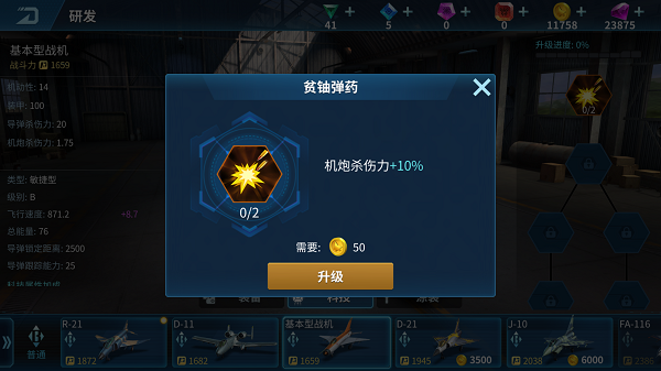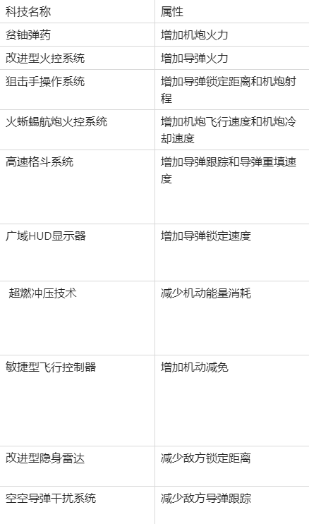 在现代空战3D中,有4种飞机,分别是攻击性、防御型、敏捷型和均衡型。每种型号的飞机注重的属性不一样,而飞机的科技也会根据飞机属性有不同的加成。 ![]() 飞机属性解锁可以大幅度提高飞机的特性和实力。一架相同的飞机,零科技和满科技操控起来的感觉是完全不一样的,让我们来看看飞机是如何升级科技的吧。 ![]() 在研发界面切换到科技,我们就可以升级飞机的科技了。飞机科技由上到下呈树形结构,每个科技有不同的进度条,当玩家解锁一项科技的所有进度后,才能显示和升级下一阶段的科技。 科技升级需要消耗金币和钻石,有部分高级战机需要消耗能量水晶解锁科技,和装备一样,飞机级别系数影响装备制造/升级/进阶消耗,也就是说级别越高的战机升级科技消耗的费用也越高。 科技属性详情表: