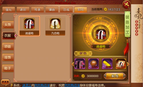 二、橙装合成 还在担心有了橙将却没有配缘橙装吗?现在开启现在开启橙装制作功能,橙将崛起之日!就是小主称霸宫廷之时。这年头,人靠衣装马靠鞍,走在宫廷里服装可绝不能马虎,从你的穿着分分钟看出你的等级。所以小主们还是勤劳些吧,争取多获得一些材料, 然后进入制作系统,为自己设计出美美的橙装吧,防御性立刻秒杀那些懒惰的小婊砸。
