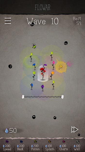 首先了解下游戏的规则,玩家的目标是守住位于屏幕中心的温室之花,其方式就是在其周围栽种拥有各种不同能力的花朵,当食花虫靠近的时候便可发动攻击,将其阻挡下来。游戏没有关卡制,玩家会在一个相同的场景坚持抗争,抵御一波又一波的敌人,直到最后守护的花防线都被攻破,温室之花被摧残就算结束了。