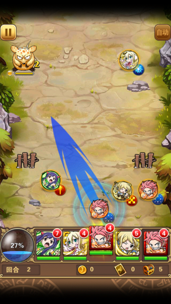 该游戏为新颖的弹珠操作,玩家按住屏幕任意位置向后拉动,确定弹出轨迹,轮到该角色攻击的回合就会像弹珠一样发射出去冲撞敌人。不需要点击角色再拉动蓄力,而是屏幕任意位置都可以操作,非常方便。