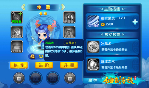 御水聚灵:提高我方场上队员防御力 冰晶术:攻击时10%几率提升团队成员40点防御力,持续10秒最多叠加5次 炼冰之术:攻击时10%几率提升我方血量最低角色150点防御,持续5秒; 除了主动技能带来的防御加成外,被动技能“冰晶术”则是水碧的核心被动技能,若连续发动可在10秒内最多增加整个团队200点的防御力。炼冰而之术可以看做是危急时刻的保命技能(前提是脸好能够发动_(:з」∠)_)。