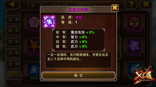 此外,还要给主公们推荐双弓箭手的梦幻混搭!黄忠、李典作为《X三国》中的极品弓箭手,两个一起镇守后排万箭穿心,再配上诸葛大神的天雷冰雹双重攻击,速战速决就是那么任性!这套阵容的亮点还在于可以用上典韦、荀彧等魏国武将作为缘分搭配,目前渐成主流! 【后排武力阵法】 魔法流靠两仪微尘阵,弓箭流唯有正反五行阵不能辜负!正反五行阵能后排加武力,是为黄忠等后排物理输出量身定做的阵法,前排可以继续遣上物理攻击强大的赵云,也可以尝试物魔双修的杀伤性武将乐进、徐盛等!当然,在刷副本的过程中,大招技能也是有用武之地的,推图用四象八卦阵,效果显著!