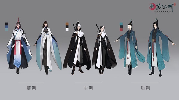 而在通常情况下,玩家的目光会优先注意到画面边界区域的颜色对比,所以在颜色的使用上,首先需要为每一个角色确认一个最有代表性的主色调,其次选择第二和第三颜色。在《新笑傲江湖》手游武当派的配色方案中,以八卦太极作为代表的黑白两色成为了该角色的主色调,这一基础基调贯穿了前中后三期的设计手稿。
