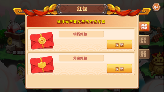 在红包系统里,你可以给帮派里面的小伙伴发铜钱红包,也可以壕气地发个元宝红包,这种好事情当然是多多益善啦~当然别人发红包的时候,千万不要眨眼睛!光速抢起!