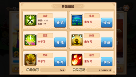 已解锁的技能可以修炼,这时候你在帮派供奉中获得的供奉值就派上用场了!帮派技能分为攻击、生命、回复、命中、暴击、韧性、闪避、防御,修炼获得属性加成会作用在所有英雄身上哦,所以千万别小看,赶快修炼起来吧~