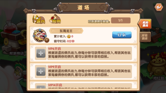 当你觉得自己快要吃土时,道场派遣千万别错过,只要派遣英雄镇守,就能根据镇守时间获得收益哟!派遣到道场的英雄战力还会影响到帮派押运成功率,所以为了帮派的建设科千万不要小瞧它。