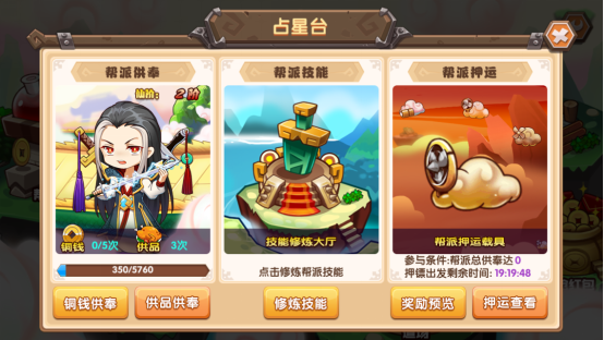 占星台是一个帮派的最为核心的位置,分为帮派供奉、帮派技能和帮派押运三个区域。据说帮派供奉里的神像有求必应,小编已经到处求神拜佛祈姻缘无果,我们先去膜拜一下帮派供奉的神像吧!