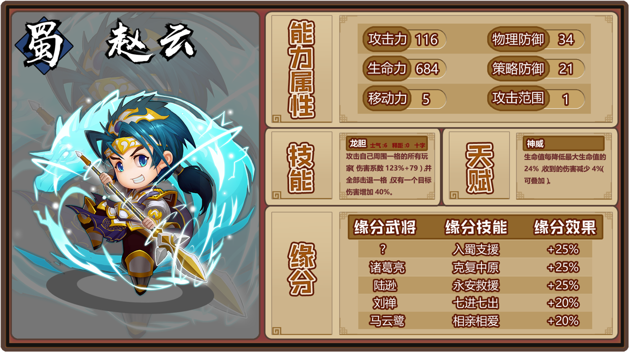 在《运筹三国》中,赵云以一名游侠的身份出现,其生命力和移动力都非常亮眼,足以傲视群雄。赵云的专属技能龙胆赋予了赵云在敌阵中大杀四方的潜力,配合范围攻击的武将可以打出更高的伤害,其天赋神威取材于赵云在长坂坡七进七出的传奇故事,这是一个强力的增益技能,只要赵云开启了技能,就会不断地获取收益,直至击垮对手,显然是一名不可多得的领军将才。