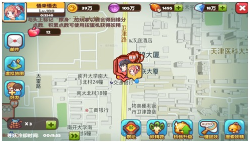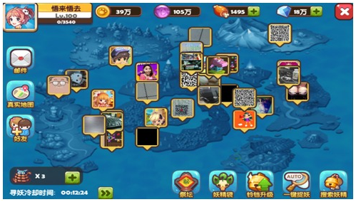 一、摇铃捉妖 游戏基于LBS系统为玩家营造了一个真实的地理环境,玩家可在进入真实地图后摇动寻妖铃来搜索和捕捉妖精。同时摇铃的玩家越多,搜索出极品妖精的几率就越大。 进入传送功能后,系统会默认进入一个虚拟地图。 点击【真实地图】按钮后会进入真实地图。 两种地图中都会显示其他同玩该游戏的玩家。 使用寻妖铃搜索妖精,点击【搜索妖精】,即可搜索附近妖精,并显示此刻同时摇铃的玩家数。 玩家地理位置发生变化,搜索出的妖精会相应变化。 点击搜索到的妖精可选择捕捉(有几率失败)、使用捆妖绳捕捉(100%几率捕捉到)和放弃。 寻妖铃每使用一次会有1小时冷却时间,累积冷却时间超过6小时,必须等冷却时间全部结束才能再次使用。也可用钻石消除冷却时间。 寻妖铃最高可升到10级,升级后可捕捉到较高等级的妖精。 VIP玩家可使用一键捉妖功能,可自动摇铃和使用捆妖绳。