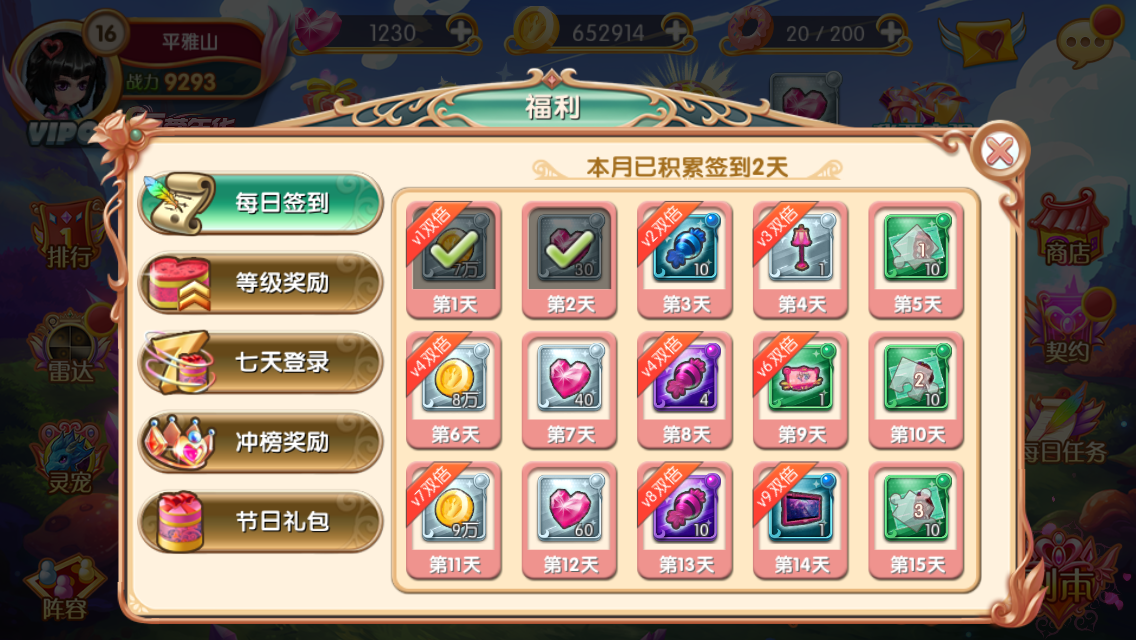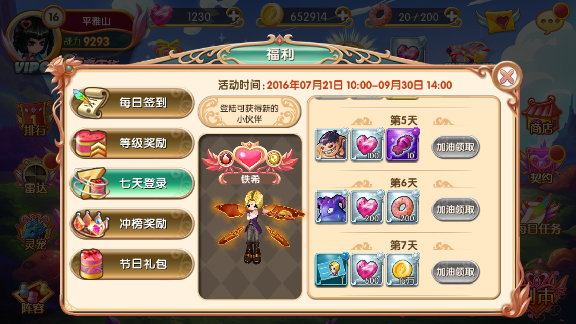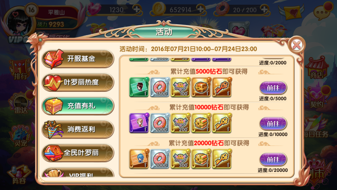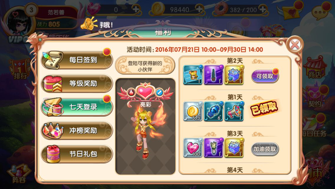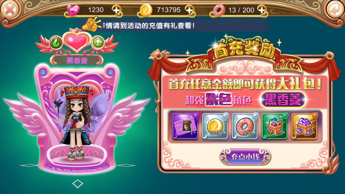 活动内容:充值任意金额,即可获得首充大礼包,包含超强紫色角色黑香菱,金币,体力等超值奖励。 ![]() 活动内容:连续登录领奖励,第二天登录即送人气角色亮彩,第七天登录送铁希,还有大量钻石,金币,宝箱的奖励,等你拿! ![]() ![]() 活动内容:累计充值1000钻,可获得王默名片;累计充值2000钻石,可获得蓝孔雀名片;累计充值5000钻石,可获得陈思思名片;累计充值10000钻石,可获得封银沙名片;累计充值20000钻石,即可在活动界面领取超人气角色——水王子! ![]()