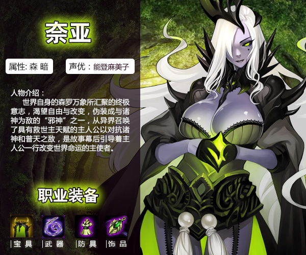 奈亚拥有暗属性和森属性,所以可以使用暗和森属性的卡牌和装备。
