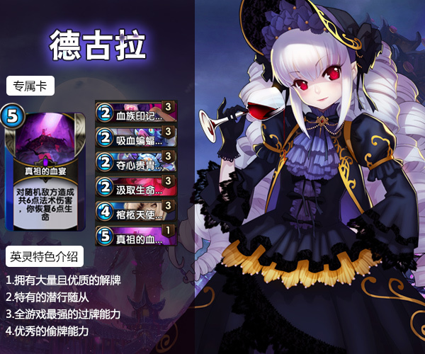 ![]() 拥有强大魔力,活过了千年岁月的吸血鬼,失去了一切而只换得了岁月的孤独者,不老不死,实力惊人。虽然有着幼女的外表并且以年幼的口吻自称,实际上 却看透世情,并且以冷酷的掠食者的标准审视一切,在这个世界上唯一惧怕的对象便是自己的“血主”,血族之源该隐,也即第一个吸血鬼。 德古拉拥有水属性和暗属性,所以可以使用水和暗属性的卡牌和装备 英雄获取方式: 完成副本1-2 真祖血宴 基础职业卡: 1费、汲取生命*3(目标生物-2/-2,你恢复2点生命)【蓝】 2费、血族印记*3(目标生物+2/+2并获得吸血2)【蓝】 3费、吸血蝙蝠*3(潜行3 对手受伤时:你恢复1点生命)【蓝】 4费、夺心贵胄*3(潜行3 对牌手造成伤害时:授予你一张对手手牌的复制)【蓝】 5费、棺柩天使*3(对手受伤时:随机敌方生物-1/-1)【蓝】 6费、真祖的血宴*1(对随机敌方造成共6点法术伤害,你恢复6点生命)【紫】 英雄职业特色 1.拥有大量且优质的解牌 2.特有的潜行随从 3.全游戏最强的过牌能力 4.优秀的偷牌能力 5.贫乳,稀有资源。 |