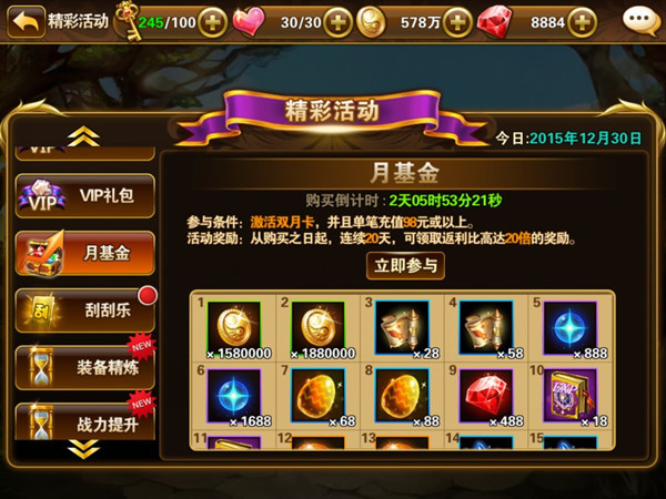 元旦即将来临,新的一年必须得嗨!《有杀气童话》跨年活动惊喜来袭,为大家带来新一年的精彩。众多元旦专题活动 跨年上线,超值月基金开放购买,魔法道具随心兑换,更有充值红利、累冲活动、消费返利与元旦福利店相约。元旦想要嗨 ?快来围观《有杀气童话》吧。 超值月基金开放购买 超高返利拿不停 新的一年,月基金助力玩家奖励拿到手软!12月30日至1月2日,《有杀气童话》将开放超值月基金购买活动,活动期间 玩家激活月卡或至尊卡,并且单笔充值金额达到98元以上即可激活月基金。激活月基金的玩家们将在接下来连续20天内都可 领取超丰厚的奖励,包括大量金币钻石、圣品精炼石、经验法典、星魂与技能卷轴,更有超多金色装备碎片宝箱等待开启。 返利比高达20倍的奖励仅开放三天,成为高富帅,拥有极品装备不再是梦。