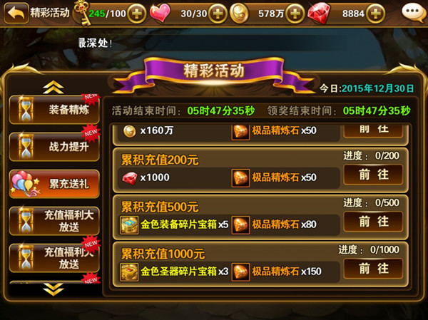 丰富活动 嗨翻元旦 另一方面,《有杀气童话》还将于元旦期间为玩家开启充值红利、元旦福利店等多重活动。12月28日至1月3日,每天充 值即可获赠钻石与海量初级经验符文,从此告别钻石之忧。与此同时,玩家在游戏中累冲金额达到一定数额后,还能领取丰 厚的道具礼包,金币钻石刷新令拿到手软,金色装备、圣器碎片宝箱更是惊喜连连。