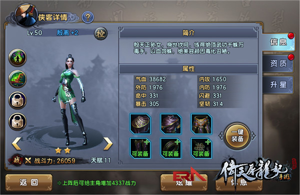 风云志界面 玩家获得侠客后,可继续对侠客进行培养,分别是侠客自身的培养和装备的培养。玩家在副本中可获得大量侠客装备,在侠客界面中可将装备穿戴在侠客身上,每当侠客穿齐一套装备后,可以对侠客进行升阶。升阶后的侠客属性加成更为强大。侠客培养需要用到资质丹,资质丹可以在日常副本和抽奖中获得。服用了资质丹之后的侠客,自身属性将得到大幅度提升。
