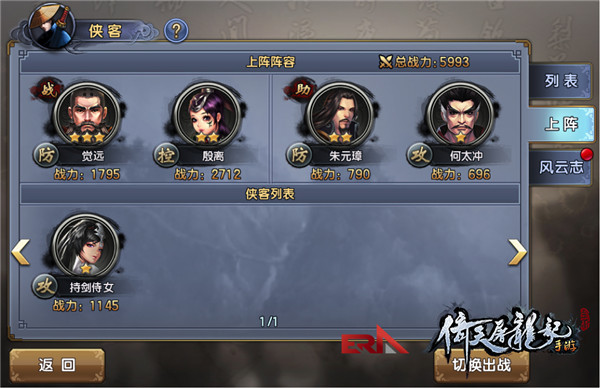 上阵界面 玩家获取到侠客后,即可激活侠客对应的风云志。而当玩家已经获得某一侠客的时候,后续再获得相同侠客将自动转换成该侠客的魂,魂是侠客升星的主要道具,满足系统要求的个数即可对侠客进行升星,升星之后侠客的战斗力会得到大幅加强。此外,玩家可以在风云志中查看到所获得的侠客给自己带来的属性加成效果。侠客之间将会有羁绊关系,意味着侠客收集的越多,玩家增加的属性也就越多。