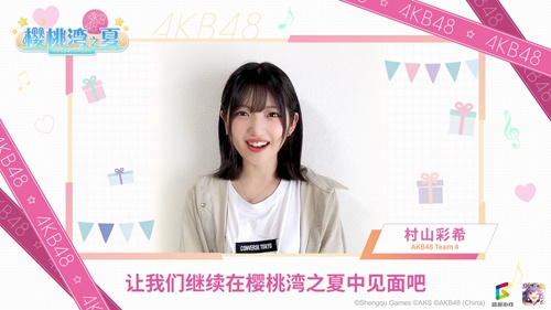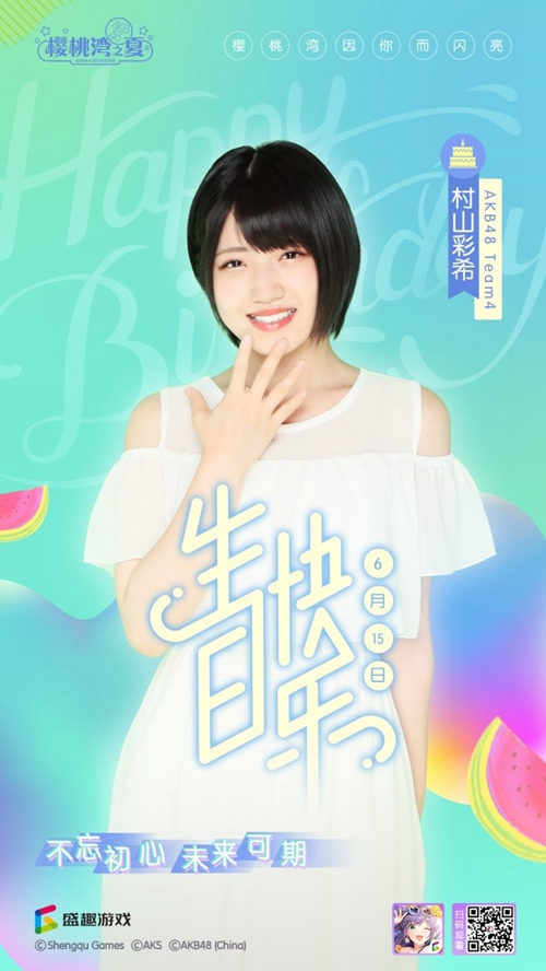 6月15日是AKB48 Team4村山彩希的生日,为此《樱桃湾之夏》的“经纪人”与粉丝们纷纷留言祝福,为村山彩希庆生。收到各位粉丝的生日祝愿后,村山彩希也特意录制了视频,将自己的感谢传达给中国的各位玩家。 村山彩希小档案: