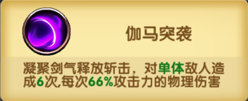 图一 用剑刃召唤雷霆能量,造成基于攻击力的单体物理伤害。尽可能多的使用三消对敌人造成伤害,同时积攒SP值,可以用来引爆强力技能。 效果: 一消造成105.00%的伤害 二消造成240%的伤害 三消造成400%的伤害 SP技能-伽马突袭 通过不断消除释放技能,可以累积产生SP技能,SP技能会对地方单体造成6次伤害,每次66%攻击力的物理伤害。