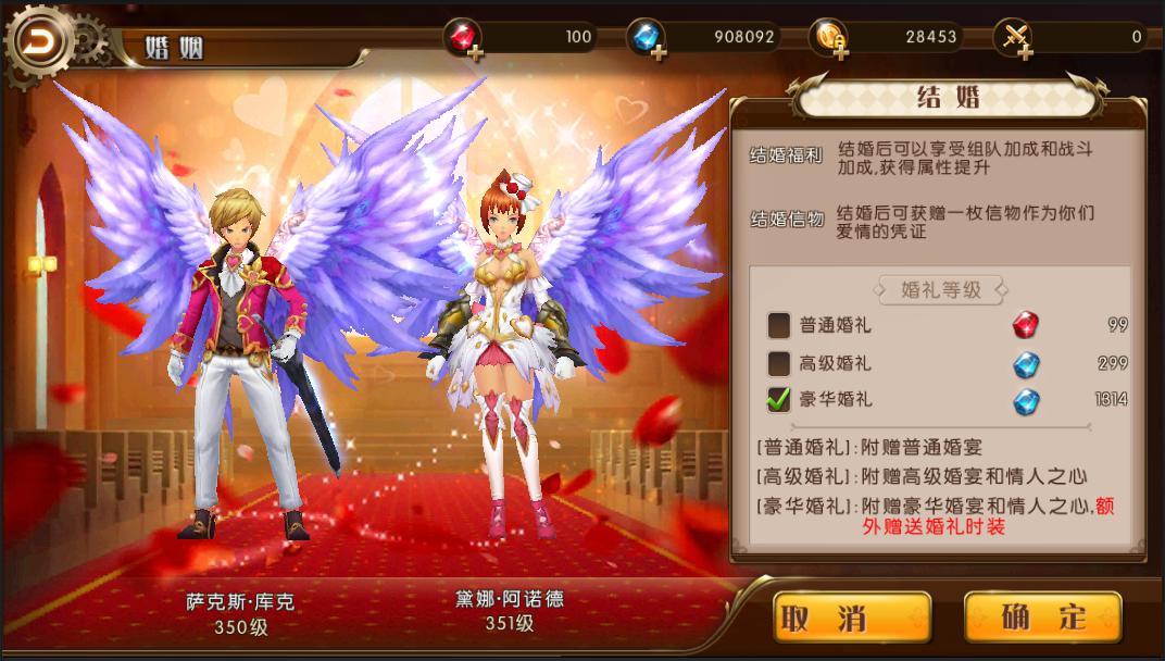《勇者荣耀》对单身的小伙伴十分友好。游戏开创即时性战斗,在勇者大陆上,四处都充满着未知的惊喜,也许你走着走着就遇到了生命中的那个ta。天涯何处不相逢,邂逅今朝不相离。如果你遇到了对的人,请速速前往神圣王城,那里有一个小姐姐,她正眼巴巴的等着你们的到来,为你们送上最神圣的祝福。婚姻系统需要两位玩家手拉着手,去紫禁城找【神圣王城女神薇娜】申请结婚,任意一人点击NPC对话发起即可。婚礼人性化地分为三个档次:【普通】、【高级】以及【豪华】。你可以选择低调朴素的婚礼,一生一世一双人,也可以选择高调华丽地娶妻or出嫁,与ta红尘作伴潇潇洒洒!