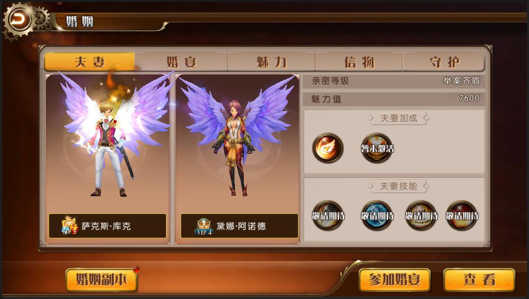 婚宴过后,玩家的幸福情侣生活就正式开启啦!提升信物等级可解锁夫妻加成和夫妻技能。夫妻组队后杀怪,将会获取经验值提升5%,受到攻击时有几率恢复自身生命值!同时,婚后还激发了夫妻被动技能,在生命值,攻击力,防御力以及暴击值方面都可以通过消耗对应技能书提升等级!夫妻合并,所向披靡!
