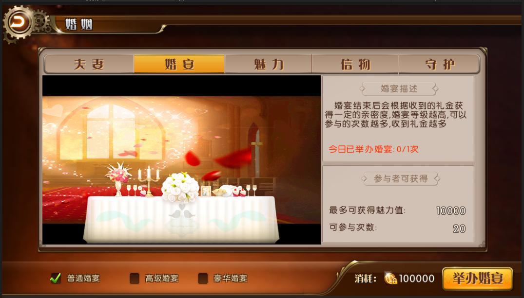 牵好小手,选好人,婚宴晚会要闹腾。玩家结婚后可主动消耗金币来举办婚宴,消耗绑定金币、火钻、蓝钻。婚宴开始后,玩家可消耗金币来参加婚宴,每场婚宴持续48小时,婚宴持续时间内不可再举办另一场;婚宴的可参加次数达到上限后婚宴提前结束。婚宴一旦开始了,就狂欢到不能停下哦~ 婚宴举行过程中玩家离婚,婚宴会提前结束,立即发放奖励。那奖励到底是什么呢?赶紧去问问【神圣王城女神薇娜】小姐姐吧~