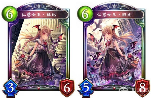 【卡牌效果】 费用:6 进化前: 3/6 仁慈女王·斑比 血色女王·斑比 如果这张卡牌在手牌中,自己剩余的能量点为6以上,并且反击状态已发动,则会在使用这张卡牌时将其转变为抉择所指定的卡牌。 进化后: 5/8 【卡牌简介】 CV: 钉宫理惠 进化前: 听说斑比总有一天会成为女王呢。嗳,仆从啊。成为女王之后,该怎么做呢? 进化后: 就算斑比变成女王,仆从也永远是仆从哦?要永远和斑比在一起,永远对斑比好哦! 【卡牌信息】 名称:仁慈女王·斑比 职业:暗夜伯爵 类型:随从 稀有度:虹卡 卡包:「起源之光、终焉之暗」