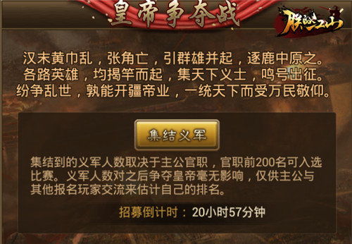 汉末黄巾乱,张角亡,引群雄并起,逐鹿中原之。《朕的江山》为了给玩家们带来东汉末年一样的割据争霸,已经正式推出全新核心玩法——皇帝争夺战,这是游戏里最终极的赛季活动,每隔一定时间玩家可以通过皇帝争夺战来决出游戏里最终的皇帝归属。集结号已经吹响,义士正在招募中。 ![]() 只要主公们的官职达到郡守就可在新战区“争帝区”参与这场史诗争霸,最后统一天下的主公将成为至尊皇帝,辅佐新皇登基的其他主公则成为诸侯。各路英雄均揭竿而起,天下义士只待鸣号出征。纷争的乱世,孰能开疆扩土,一统江山呢? ![]() 目前集结义军的活动还在进行中,集结到的义军人数取决于主公的官职,官职前200名可入选比赛。义军的人数对之后的皇帝争夺战不会有影响,只是主公与其他报名玩家交流的一个数据。 ![]() 最终入选争帝区的主公们将会获得丰厚的礼包,助大家征伐天下。征战过程中还能完成每日政务事件以领取各种道具。不能入选的玩家也不用懊恼,因为你只要报名就能或100元宝奖励。还没报名的玩家可点击游戏主界面右上角“皇帝争夺战”按钮进行报名,征伐天下,从现在开始。 |