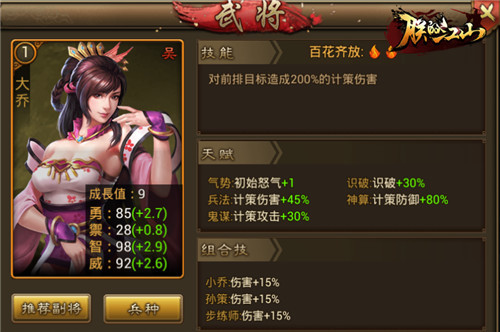 曹操修铜雀台,曹植作《铜雀台赋》,其中有“揽二乔于东南兮,乐朝夕之与共”的句子,后又有诗“东风不与周郎便,铜雀春深锁二乔”,就是说如果不是有东风成全周瑜的火烧之计,曹操恐怕早就破了东吴,把二乔抢回去锁在铜雀台了,自古英雄确实是爱美人的啊。今天也来看看《朕的江山》里入得宫廷上得战场的美人吧。![]() 首先登场的蜀国巾帼,因为这是很多玩家最早抽到的武将。其中出场率最高的莫过于糜夫人,小说《三国演义》里糜夫人在长坂坡为了不拖累赵云投井自杀,可谓是女中豪杰。《朕的江山》里作为一个适用性超强的奶妈登场,紫将品质的她培养难度低,很多阵容都可以上阵,是各位主公不可多得的奶妈哦! ![]() 下面来说说中国古代四大美女之一的貂蝉,三国的故事里王允将貂蝉收为义女,定下连环美人计,离间董卓与养子吕布的关系,可以看得出貂蝉的美色是多么的厉害。游戏中的貂蝉是一个橙色武将,能够对敌人的前排造成高额的计策伤害,同时只需两点怒气,很容易灭掉敌人的前排,是一个不可多得的输出。 ![]() 最后我们来说说游戏里的大小乔吧,他们能够令曹操这位奸雄专门建造一个铜雀台,可见曹孟德的觊觎之心啊。游戏中的姐妹俩能够一同组合登场获得伤害+15%的buff,大乔主要打击敌人前排,而小乔可以对全体敌人造成伤害,上阵不离姐妹花哦。 ![]() 《朕的江山》是一款以三国为背景的“小局制”SLG手游,题材类型契合广大玩家需求,采用新颖的轮回小局制游戏模式,精简内政系统,游戏目标明确。在游戏中玩家穿越至三国时期,扮演一方诸侯招兵买马、发展内政、扩张势力,最终吞并天下。 |