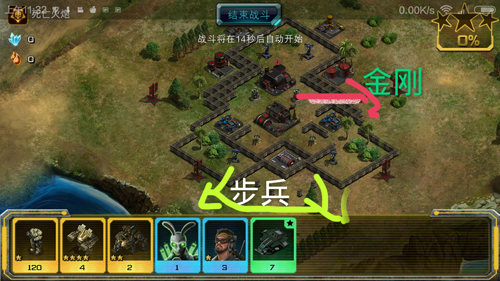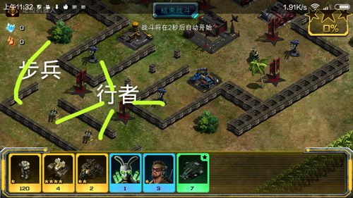 其中这一关怎么应对呢,大家看图片我们可以多点金刚,然后让金刚移动速度增加,那么咱们得雇佣这个指挥官,先用金刚吸引那两个榴弹炮,然后你再加步兵,如果你步兵级别高的话少放点,我步兵一直没升级,我得多放点,打完几个炮以后,他们会集合攻打后俩个重机枪,最后就OK了哦。 下面再介绍下一关了