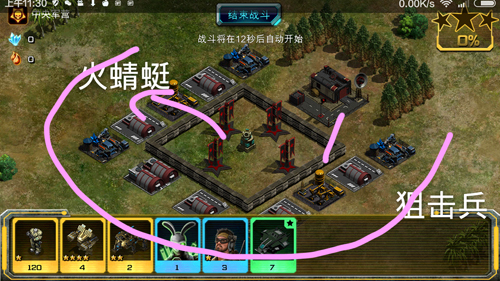 大家看一下上面,先放一个火蜻蜓榴弹炮是打不着的,等榴弹炮消灭了,你们再放步兵,并且把他们放在最外围,相信这关挺简单的。当然还有方法,就是把狙击兵部在最外围,等把所有的建筑消灭了他们会消灭榴弹炮,谢谢大家。 再次说一声,我玩的时间不长,就过到这边了,很高兴和你们分享我的心得,希望能帮到大家谢谢! 下面我再给你们介绍一下副本第六关哦,欢迎大家来看。 第六关:副本 离子风暴 这一关呢,有了新的"武器”即特斯拉塔,这种东西破坏力极大看下面这幅图