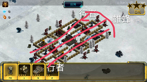 大家看到他就有点惧,但是你们要记住,没有催不毁的炮塔,基地,但我们仔细看看,就会偷笑因为可以用到雄蜂了,首先咱们放一个行者,看图片,吸引他们的火力,然后赶紧放雄蜂,让它把特斯拉塔摧毁,然后我们再适当放一些步兵,这样呢就可以胜利了哦 其中为啥不用火蜻蜓呢?,因为它速度太慢,有时候用不着它…… 还有这一关,大家看下边这张图片