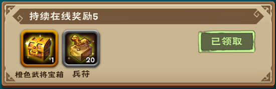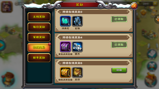 前往【奖励-在线奖励】每在线一段时间即可领取资源。从最基础的银币与淬炼石,到有几率产出橙色武将碎片的宝箱,均可在这里获得。