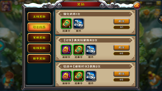 每日奖励中可以看到日常的任务。完成这些任务后,可以得到额外的奖励。 前往【奖励-每日奖励】界面,每日奖励中发布。 每日任务中包括了攻打城池、强化武将、强化装备、培养战马、PVP等项目,完成这些任务,不但可获得大量银币,更可获得刷新令与招募令等重要物资。