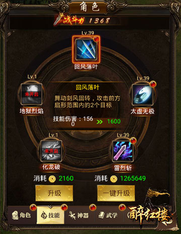 技能包括回风落叶、地狱烈焰、太虚无极、化龙破和雷烈斩。回风落叶,舞动剑风回转,攻击前方扇形范围内的2个目标;地狱烈焰,从脚下爆炸出地狱烈焰对周围1个目标造成伤害;太虚无极,幻化出2把太极剑,攻击锁定范围内的2个目标;化龙破,神龙降临对飞过范围内的1个目标造成伤害;雷烈斩,凝聚雷之力召唤落雷,攻击周围随机2个目标。技能最始等级为1,玩家可通过消耗金币进行升级。