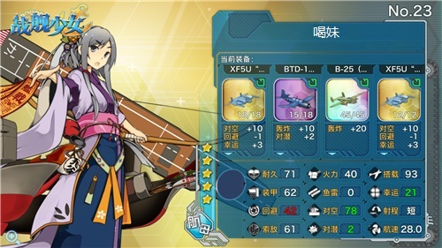 载机的名目繁多,但最优秀的还是要属几首金闪闪: 战斗机:“海毒牙”11对空、“FX5U飞行圆饼”10对空、3幸运、-1回避、“烈风”9对空11回避 轰炸机:六星“B25杜立特队”20轰炸 鱼雷机:“流行”10鱼类4反潜1索敌 需要额外提及的是,六星轰炸机“B25杜立特队”属性惊人,铝消耗也惊人,单加耗铝是其余战轰炸机的三倍左右——这艘五彩斑斓的杀器只在5-3BOSS点产出的大黄蜂有携带,就算大建出不了喔!
