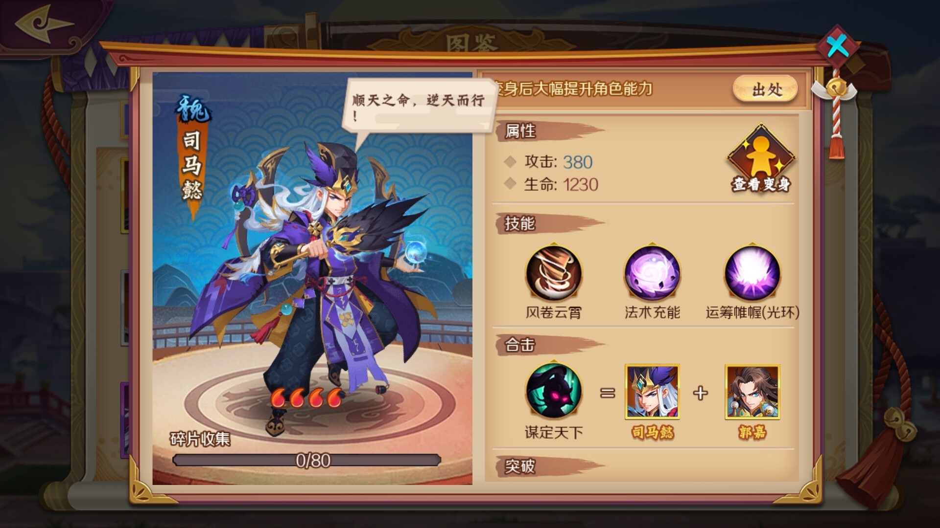 司马懿(179年—251年9月7日 ),字仲达,河内郡温县孝敬里(今河南省焦作市温县)人。三国时期曹魏政治家、军事谋略家、权臣,西晋王朝的奠基人之一。 司马懿自幼聪明多大略,博学洽闻,伏膺儒教。曹操任丞相后,强行辟司马懿为文学掾。因司马懿曾支持曹操称帝,所以逐渐赢得了曹操的信任。曹操封魏王后,以司马懿为太子中庶子以佐助曹丕,帮助曹丕在储位之争中获得胜利。曹丕临终时,令司马懿与曹真等为辅政大臣,辅佐魏明帝曹叡。明帝时,司马懿屡迁抚军大将军、大将军、太尉等重职。明帝崩,托孤幼帝曹芳于司马懿和曹爽。曹芳继位后,司马懿遭到曹爽排挤,升官为无实权的太傅。正始十年(249年),司马懿趁曹爽陪曹芳离洛阳至高平陵祭陵,起兵政变并控制京都洛阳。自此,曹魏的军政权力落入司马氏手中,史称高平陵事变。司马懿善谋奇策,多次征伐有功,曾率军擒斩孟达,两次率大军成功抵御诸葛亮北伐,远征平定辽东。对屯田、水利等农耕经济发展有重要贡献。 ![]() 嘉平三年(251年),司马懿病逝,享年73岁,辞郡公和殊礼,葬于首阳山,谥号宣文。其次子司马昭封晋王后,追谥司马懿为宣王;其孙司马炎称帝后,追尊司马懿为宣皇帝,庙号高祖 。 ![]() 司马懿在三国演义中作为魏国军师,是曹操的心腹,但是却又被曹操一直所防备压制,临死前都要警告自己的儿子曹丕防备他。但是他作为隐忍的代表性人物,硬是熬过了魏国的几代人,最终取而代之。 司马懿与郭嘉拥有强力的群攻合击技能,配合着自己的风卷云霄能够在战斗一开始就抢占上风。运筹帷幄光环加上法术充能,一方面强化自己阵营的武将,提高法术伤害,又给予自己强大的输出能力,是一名不可多得强力武将。 |