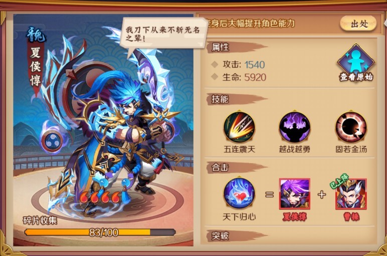 夏侯惇(?-220年6月13日),字元让,沛国谯(今安徽亳州)人。夏侯惇是西汉太仆夏侯婴之后,夏侯渊族兄。勇猛善战,十四岁时有人羞辱其师,他便将那人杀死。曹操举兵讨伐黄巾军时,夏侯惇随曹操征讨,担任裨将。 年时以勇气闻名于乡里。曹操起兵,夏侯惇是其最早的将领之一。与吕布军交战时,曾一度被擒为人质,又被流矢射瞎左眼。多次为曹操镇守后方,曾率军民阻断太寿河水,筑陂塘灌溉农田,使百姓受益,功勋卓著。历任折冲校尉、济阴太守、建武将军,官至大将军,封高安乡侯,追谥忠侯。青龙元年(233年),得以配享太祖(曹操)庙庭。 初平元年(190年),讨董卓联军组成后,曹操行使奋武将军,更以夏侯惇为司马,跟随曹操到扬州募兵。曹操建立势力后,派夏侯惇屯白马,不久又升折冲校尉,领东郡太守。 ![]() 三国中的夏侯惇像曹操的护卫队一般,虽然没有打过什么出名的战役,但是他的一件事让人难以忘怀。夏侯惇在徐州攻防战时迎战吕布部将高顺,高顺败逃,夏侯惇从后追赶,不料遭另一名敌将曹性射箭偷袭。夏侯惇左眼被射中,痛得怒吼一声便匆忙用手拔箭,却不慎连着眼珠子拔了出来。夏侯惇立即大喊:“父精母血,不可弃也!”便把眼睛塞进嘴巴吞咽下去;然后又挺枪纵马,上前杀了曹性报回一箭之仇。 游戏中的夏侯惇可谓是顶尖的武将之一了,得此将领天下可定。他拥有五连击和越战越勇的技能,每局都会增加自己的伤害,一刀比一刀凶狠,试问谁能挡得住这连续五刀呢?而固若金汤则保证他能在战场待的更久,充分发挥自己越战越勇的优势,完败敌军! |