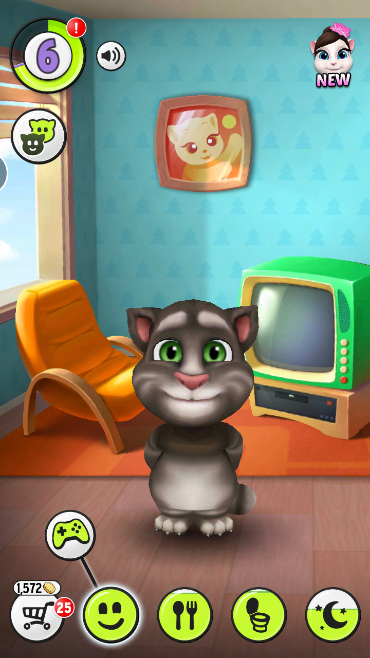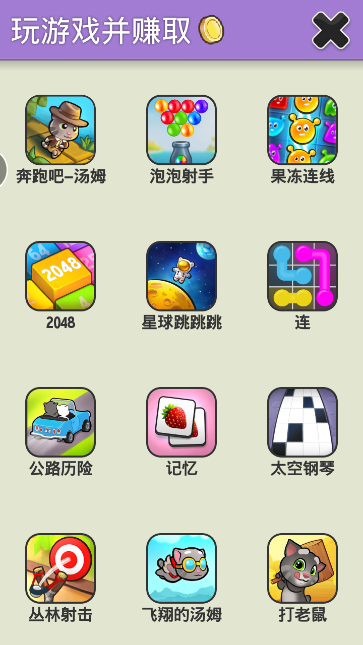 玩游戏能让你的汤姆变得开心,增加心情状态值,更可以通过内置游戏,赢取游戏金币,乐趣无穷。