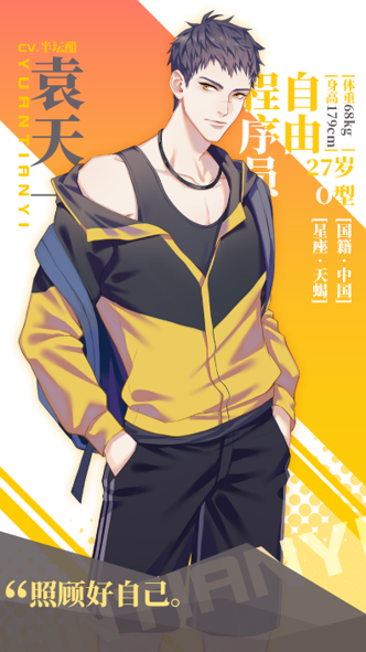 公馆的中“隐形总裁”——袁天一。 身高179cm,体重68kg,生日11月20日,星座双子座,O型血,全栈程序员。 天才程序员,拥有两家公司,在编程上有自己的美学。赚钱就花,没有存款。同熟人发消息的时候常使用颜文字和表情包。目前正和合伙人研发休闲养花小游戏中。喜欢二次元美少女,在现实里是秘密。经常因为装扮和体型被误认为是外国人。