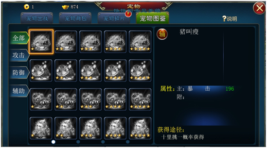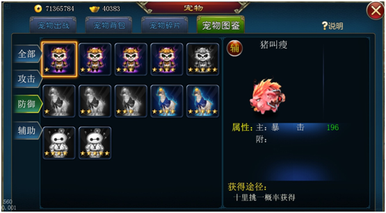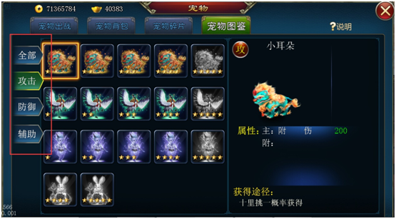最右边的分栏,将宠物按照不同属性分为了攻击、防御、辅助三类,可以直接按照属性的分类查看宠物哦。