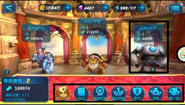 竞技场玩法是最能装逼的也是最能体现个人能力的玩法,高的排名让别人仰望的存在,下面就带大家走进众神风云的竞技场看看。![]() 进入方法:等级达到20级开启该玩法,进入即可看到竞技场主界面,在竞技场选择一个玩家即可进入战斗预备界面。 ![]() 主界面的玩家可以通过换一换来刷新玩家列表,还可以通过荣耀奖励以及排名奖励来查看对应的排名该获取的奖励物品。战记用于查询近段时间进行的战斗。每天可以进行五次挑战,五次过后在挑战的话就需要消耗钻石了 ![]() ![]() 进入后可以看到对方的阵型,可根据对方神灵来选择自己的阵容,以便针对性的取得胜利。还可通过左下角的模式来选择自己是防御模式还是攻击模式(防御模式防御高攻击低)(攻击模式攻击高防御低)。简单的介绍了一下竞技场的阵容的选择,下面来进入竞技场看看。 ![]() 战斗只能是自动战斗无法变更,这个个人感觉有点坑。游戏界面中间的时间是倒计时(我靠,什么鬼还有倒计时!)倒计时还剩30秒时进入狂暴时间模式(攻击加速)倒计时没有打败对方判定为输。通关胜利即可获得竞技币,竞技币可在竞技商店购买各种材料,这个还是挺人性化的,很多游戏竞技场商店就几个东西 ![]() 实时竞技玩法就有点有点可爱了,(有了竞技场还加个实时竞技?什么鬼)进入界面和竞技场的预备界面一样,唯一不同的介就是看不见对方的整容全靠猜。进入后选择完自己的阵容后点击战斗按钮即可开始匹配了。 |