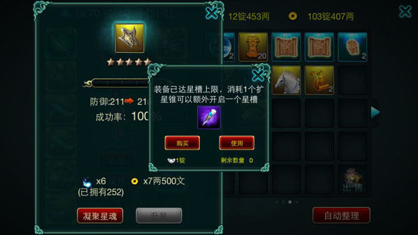 备注:升星需要消耗聚星宝石。升星可以较大的提升装备属性。 对于游戏装备已经达到其升星最大值(例如一件只有5个星孔的装备已经升到了5星),那么还能进行升星么?答案是肯定的,玩家可以通过购买:扩星锥来对装备进行额外的开孔进行升星从而突破装备本身的属性,获得更高的属性提升。