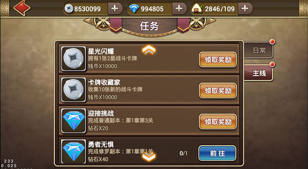 ?每日重置时间为次日的凌晨6点。通过每天完成日常任务,我们可以获得非常可观的银两,人物经验,想要快速升级只管狂点击“前往”任务!还有活跃值,获得一定的活跃值后,可兑换额外的奖品,想要让自己变得更加强大,不落后于其他小伙伴,每天完成日常任务是必不可少的哟。主线任务: