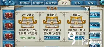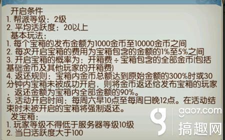 每周六早晨10点到周日晚上24点。 需要帮派等级2级以上,平均活跃度20以上才能进行。 帮派成员直接发布金币宝箱即可。 2、帮派宝箱开启规则: 全新帮派宝箱活动,所有符合条件的帮派成员均可参与。在活动开启的时间内,由帮派成员发布金币宝箱,其他成员可以支付小额费用进行开启。 成功开启宝箱即能获取箱内奖励,没有开启宝箱的会强制返还金币给玩家(只剩下原先金币的90%)。