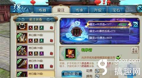 对应的装备是:攻击、暴击、真气。 那么宝石是:攻击、暴击、命中/暴伤加成/真气 宝石是可随时调换的,那么命中或真气是用来PK对应,命中或暴伤加成是副本对应。 同理,各位自行思考如何取舍,没有绝对的适合,只有相对的适合。 宝石镶嵌的核心是要明白自身门派的关键属性,然后进行匹配。比如青云的攻击、暴击;合欢的爆伤、攻击;鬼王的真气、命中;天音的命中、暴击。 诛仙手游装备灌注技巧: