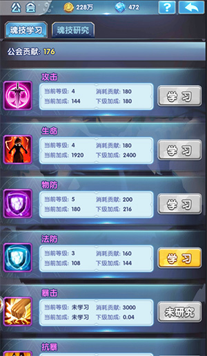 公会是《斗罗大陆神界传说》的一个非常有助于玩家斗罗交互的系统,进能携手兄弟去争霸,退能呼朋唤友扯牛皮。除此之外,公会还能给玩家们带来非常给力的实力提升,没错,它就是公会界面的公会研究。 ![]() 公会功能,需要升到26级才可以开启。达到这个等级以后,就会自动解锁,然后玩家有两个选择,加入公会或者创建公会。一般来说,对于小号,加入一个大公会是明智的选择,当然如果玩家有要发展壮大属于自己的公会的那也可以选择创建公会的。 进入公会之后,点击公会界面,有好几个选择:公会大厅、公会翻牌、公会商店、公会副本、还有公会研究。其中玩家去通关公会副本,就会获得公会贡献点数,这些点数有两个用途。一个是到公会商店里面去购买材料物品等,另外一个就用来进行公会研究! ![]() 如图,公会研究里面一共有魂技学习和魂技研究,其中魂技研究只有会长和副会长才能进行。普通会员就只能进行魂技学习,魂技学习需要公会贡献点!学习这些,没别的,就一句话,增强玩家的战斗力!没错,而且是大幅增强,比起魂师的装备升级还要强力。 ![]() 因此,想要快速增强自己的战斗力,公会里的公会研究是一个非常好的方式,玩家们要做的就是多点去攻打公会副本,为自己积攒更多的公会贡献点,这就很舒服了! 关于《斗罗大陆神界传说》: 唐家三少正版IP授权玄幻巨制,2017年最受期待的人气IP手游。游戏以魂师收集培养和团队策略对战为核心玩法,完美移植了原著剧情,并融合诸多经典斗罗元素,武魂狂暴觉醒、神器疯狂对轰、魂师燃爆乱斗,瞬间将玩家带入诸神大战、热血沸腾的斗罗世界,体验最正统最纯粹的斗罗修行之道! |