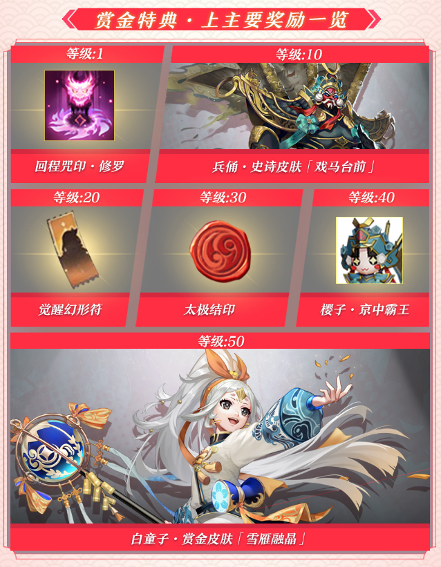 解锁赏金特典后,达到10级时,即可领取兵俑赏金特典专属皮肤[戏马台前],达到50级时,可获得式神白童子赏金特典专属皮肤[雪雁融晶]。