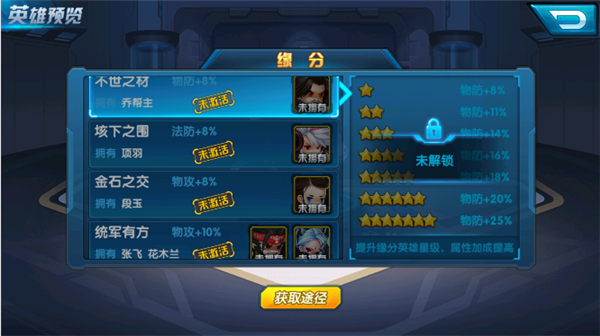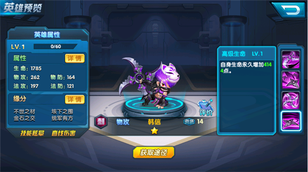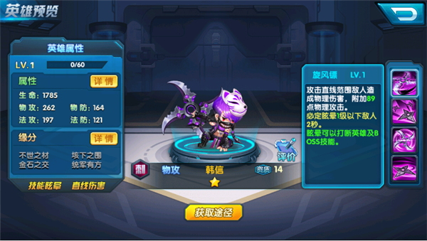 西汉开国功臣,中国历史上杰出军事家,与萧何、张良并列为汉初三杰,与彭越、英布并称为汉初三大名将。 英雄分类:物理攻击 ![]() 旋风镖:攻击直线范围敌人造成物理伤害,附加89点物理攻击 流星镖:攻击地方单体造成物理伤害,附加266点物理攻击。 回旋镖:攻击地方随机单体造成物理伤害,附加1106点物理攻击 高级生命:自身生命永久增加4144点。 ![]() 乔帮主:不世之材----------物防+8% 项羽:垓下之围------------法防+8% 段玉:金石之交------------物攻+8% 张飞 花木兰:统军有方-----物攻+10% ![]() |